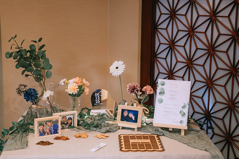会場装花については、「緑いっぱいの雰囲気にしたい」という希望をフローリストさんにお伝えしました。式が近づくにつれていくつか変更をお願いしましたが、当日の仕上がりは想像以上で、イメージ通りの空間に感動しました。