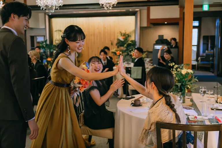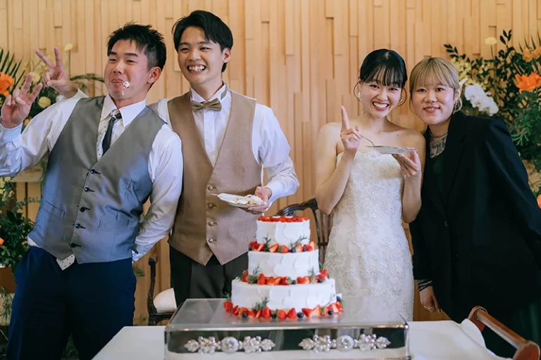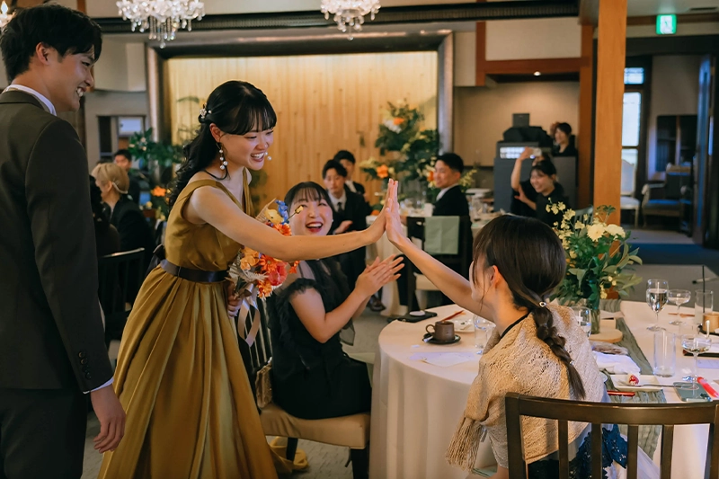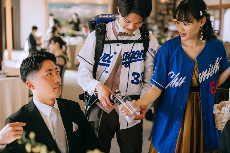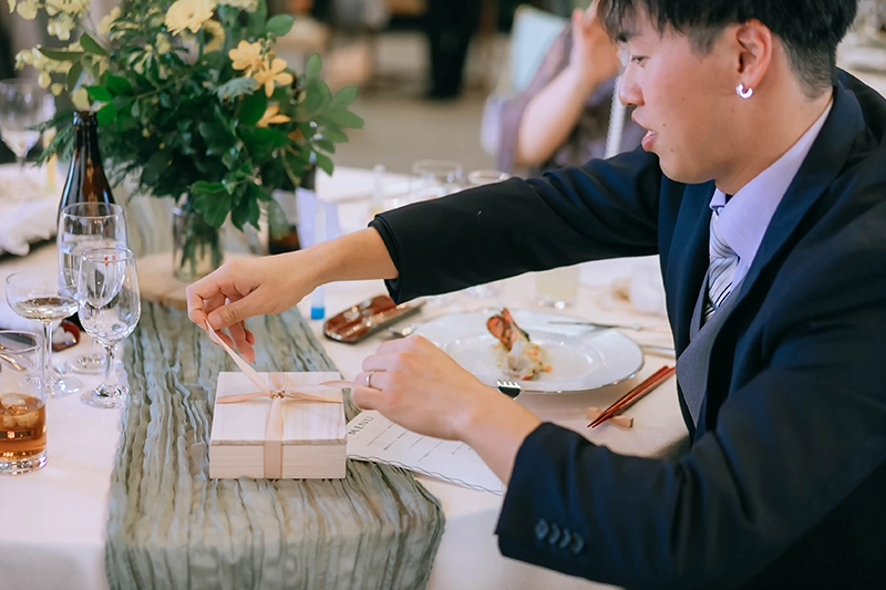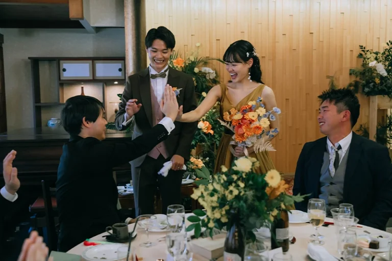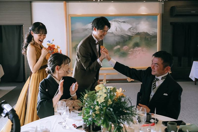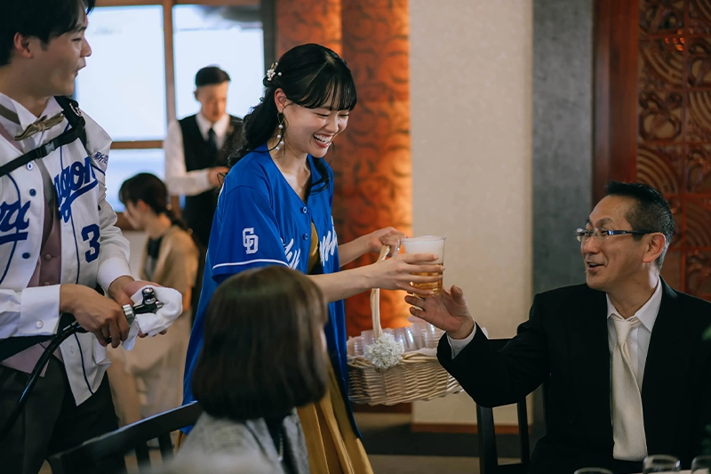 挙式・披露宴では、ビールサーブやお手本バイト、サンクスバイト、中座中のプレゼントなど、感謝の気持ちを伝える演出をたくさん取り入れることができました。ゲストの方と写真を撮ったり、ゆっくり会話を楽しめた時間も、とても嬉しかったです。